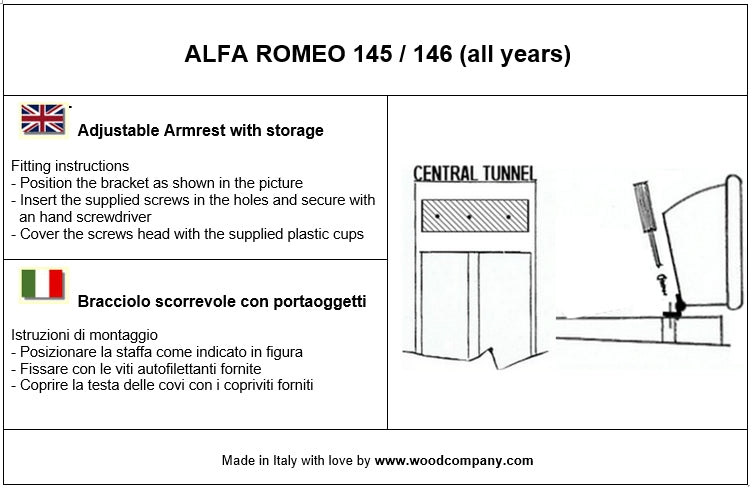 Prodotto progettato e realizzato espressamente per questo modello di auto, non si tratta di un bracciolo universale adattato. Realizzato interamente in Italia da esperti artigiani, utilizzando solamente materiali di alta qualità.