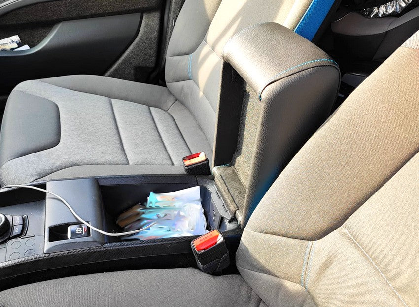 Il bracciolo si solleva (ribaltandosi all’indietro) permettendo l’accesso al portaoggetti originale presente sul tunnel centrale dell’auto.
