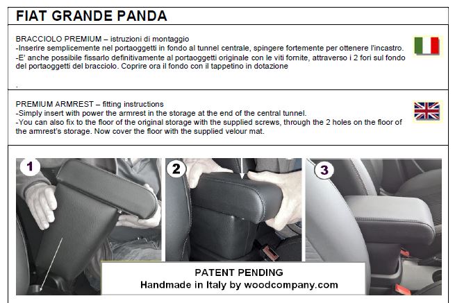 Bracciolo regolabile in lunghezza specifico per Fiat GRANDE PANDA con installazione in “PLUG-IN” a pressione, senza bisogno di viti, evitando quindi di danneggiare l’auto praticando fori).