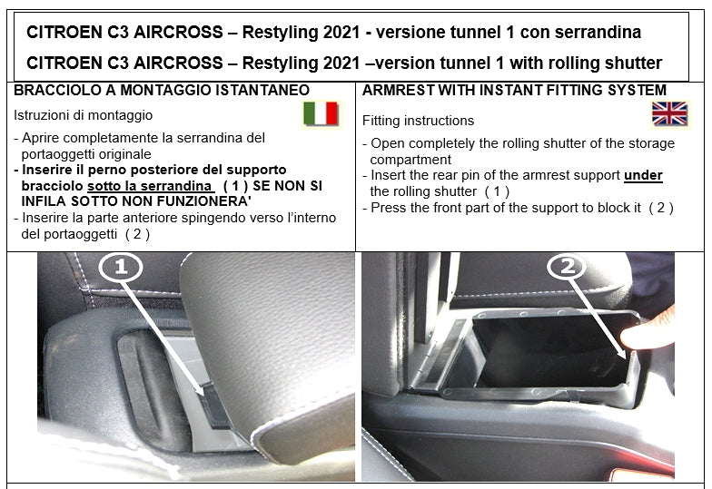 Bracciolo specifico per Citroen C3 Aicross (2021-2024) versione tunnel centrale CON serrandina, con installazione “PLUG-IN” a pressione, senza bisogno di viti, evitando quindi di danneggiare l’auto praticando fori. SI INSTALLA SOLO SU TUNELL CENTRALE CON SERRANDIANA (vedi foto nella galleria immagini)