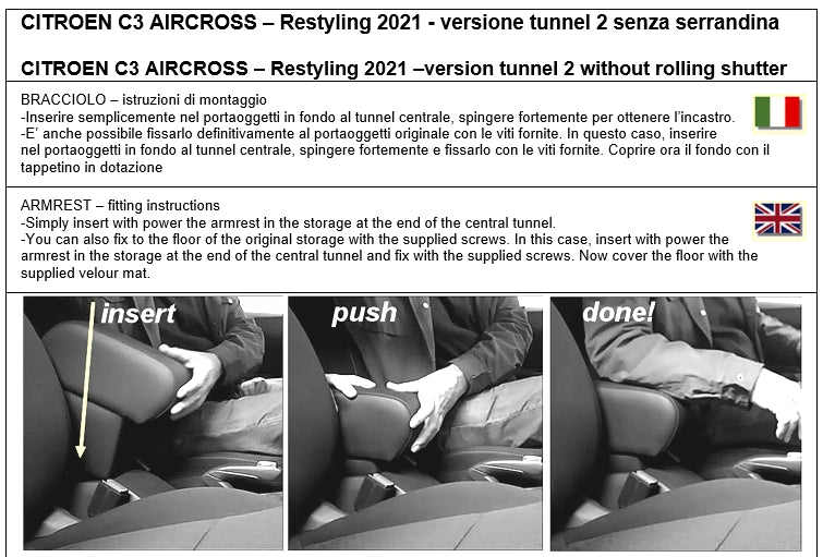 Bracciolo regolabile in lunghezza specifico per Citroen C3 Aircross (2021-2024) versione tunnel centrale SENZA serrandina, con installazione in “PLUG-IN” a pressione, senza bisogno di viti, evitando quindi di danneggiare l’auto praticando fori. SI INSTALLA SOLO SU TUNELL CENTRALE SENZA SERRANDIANA (vedi foto nella galleria immagini)