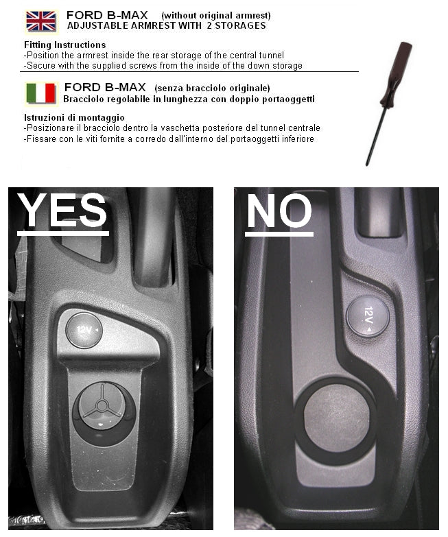 Bracciolo regolabile in lunghezza e ribaltabile per Ford B-Max con installazione “PLUG-IN” a pressione, senza bisogno di viti, evitando quindi di danneggiare l’auto praticando fori. Bracciolo dotato di 2 ampi portaoggetti e di un morbido cuscino.
