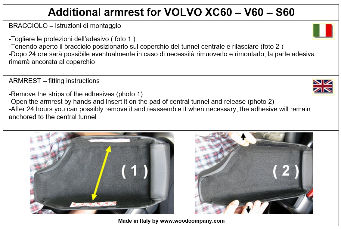 Bracciolo addizionale specifico per Volvo XC60-V60-S60 1° serie (2008-2016) con installazione completamente invisibile, senza bisogno di viti, evitando quindi di danneggiare l’auto praticando fori.
